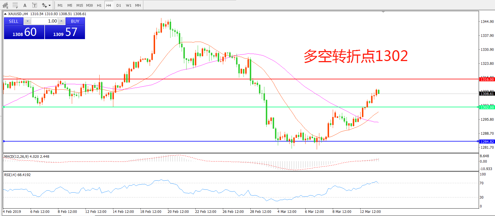 美国1月耐用品订单月率为0.4%,创两个月新高,这表明今年年初企业在设备上的支出强劲。周二英国政府版脱欧协议在下议院“二度败北”之后,英国议会再次就脱欧命运进行关键投票,英国议会还将投票表决是否将3月29日这一脱欧日推迟。金价在触及日内低位后震荡上行,目前已运行在1300上方,短期上行概率较大。