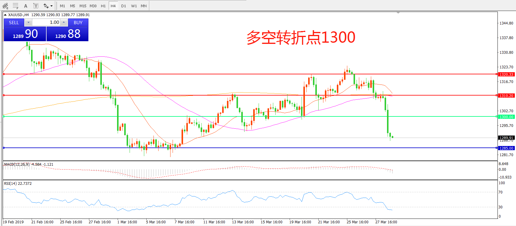 美债收益率停止跌势,此前公布的美国GDP数据虽然不及预期但就业稳定,美元指数连涨三日,最高涨超0.3%,刷新3月11日以来高位至97.30,打压大宗商品价格。 现货黄金周四(3月28日)跌近20美元,连破1310 1300 两道关口,1285支撑岌岌可危。