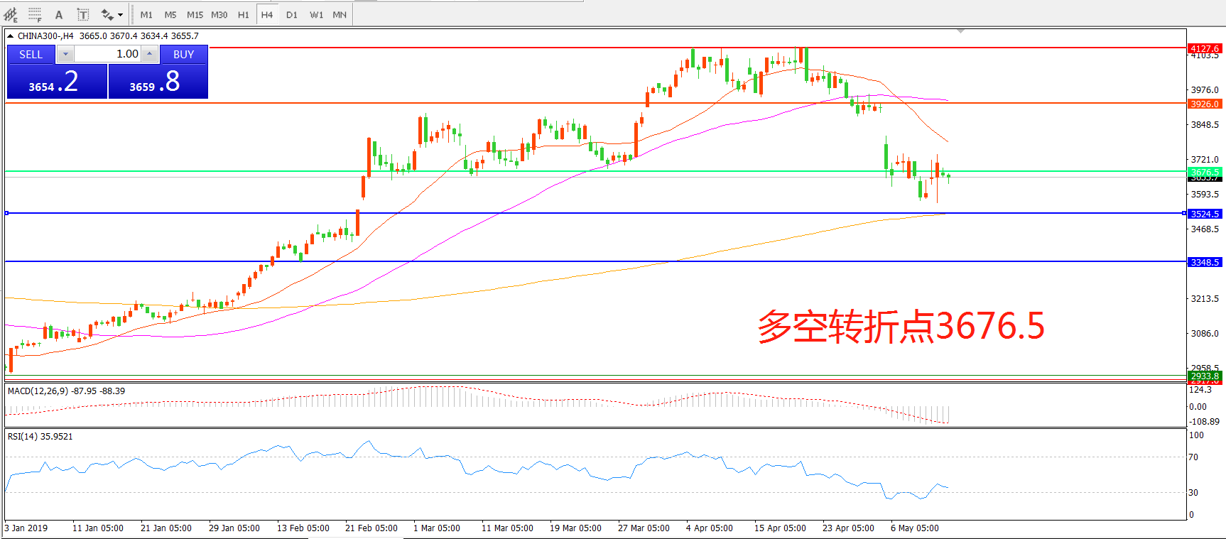 4小时图看,沪深300指数在连续下行后企稳,200均线成为短线支撑,短期均线依然向下,MACD绿柱增加,RSI指标拐头,日内震荡下行概率较大
