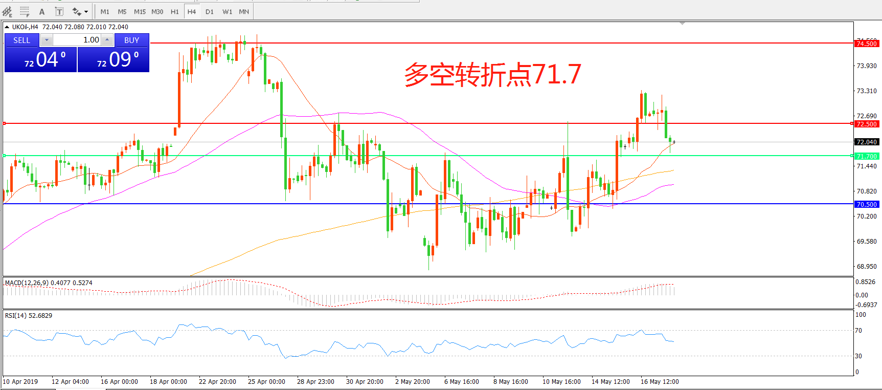 4小时图看,油价突破72.5美元后快速回落,双方围绕多空分水岭附近进行反复争夺,整体走势方向并不明朗, MACD红柱减少,RSI有拐头迹象,日内预计仍以震荡走势为主。