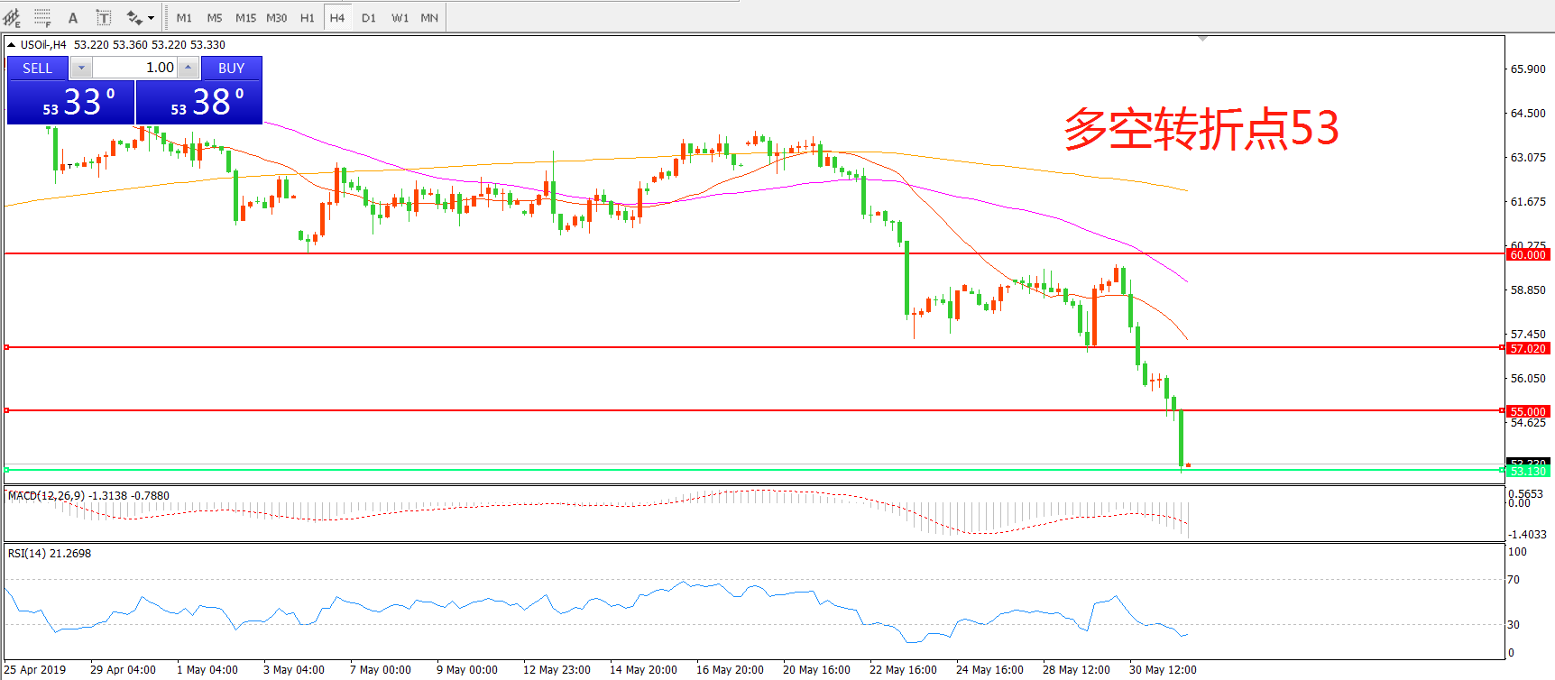 北京时间周五早上,美国总统特朗普突然“翻脸”,宣布将对来自墨西哥的所有进口商品加征5%关税,直到该国阻止移民非法进入美国。特朗普31日在推特发文称,关税将于6月10日生效,“直到非法移民不再经由墨西哥进入美国”。 该计划将从6月10日起对墨西哥进口产品征收5%的关税,随后每月上调5%,10月1日起将提高至25%。据美国能源部的数据,美国向墨西哥出口的燃料也比其他任何国家都多,这一威胁加剧了人们对全球经济增长的担忧。由于特朗普的突然翻脸,WTI原油大跌逾6%,收报53.22美元/桶,整个5月份,WTI原油下跌16%,录得7年来同期最差月度表现。