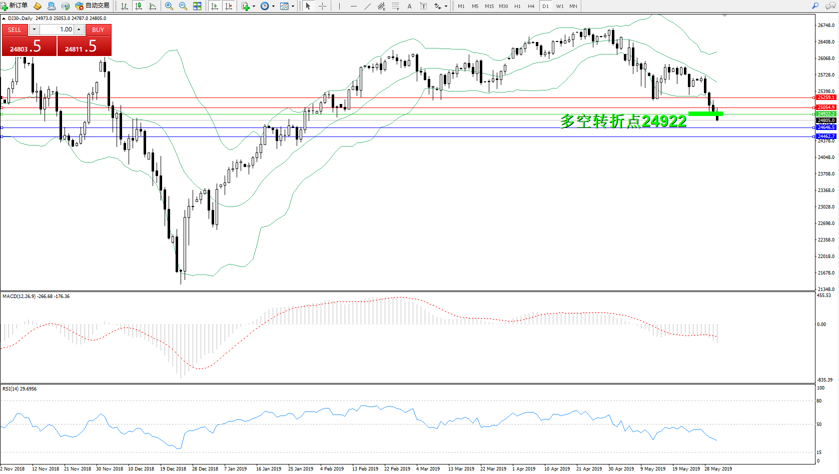 5月创今年来最差月度表现,道琼斯指数收跌354.80点,跌幅1.41%,报24815.04点;道指累跌3.01%连跌六周、创2011年以来最长连跌周数,美国总统特朗普周四扬言,将对墨西哥所有输美商品征税,关税起点为5%,然后逐步调高,直至非法移民停止从墨西哥入境美国。这可能会打击利润丰厚的跨境能源贸易;美国炼油商每天进口大约68万桶墨西哥原油;5%的关税使他们的每日购买成本增加了200万美元。