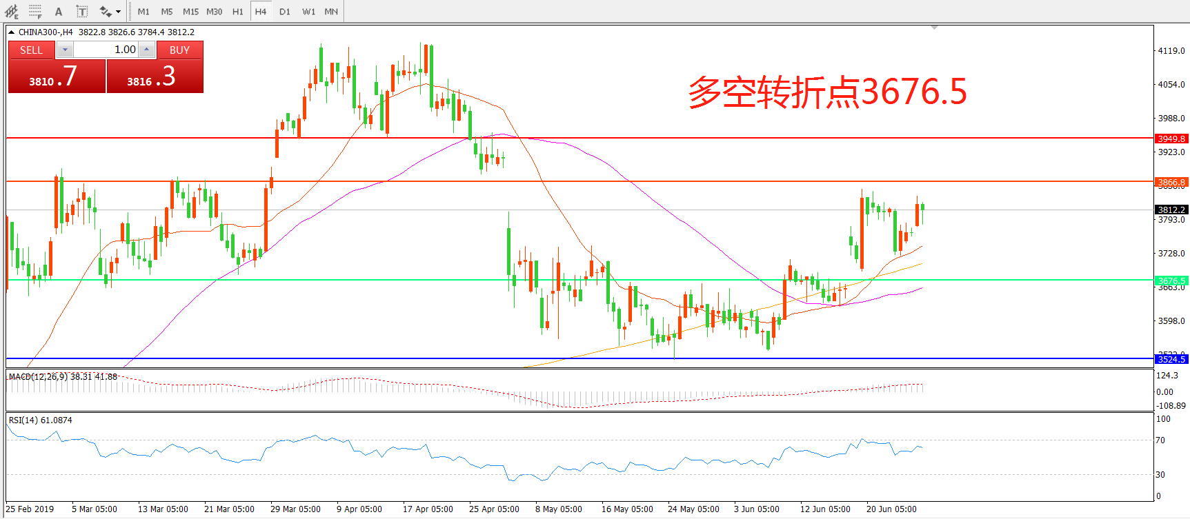 4小时图看,沪深300指数冲高后高位跳水,但整体依然处于均线支撑之上,MACD红柱增加,RSI指标拐头向上,日内延续震荡概率较大。