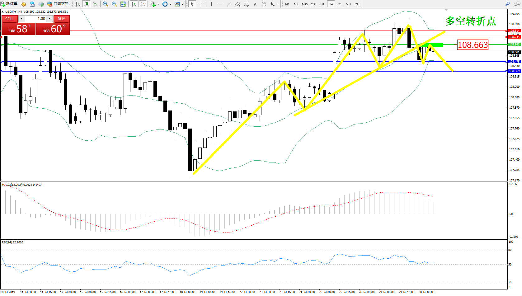 交易策略:108.663下方看跌,目标108.475108.369