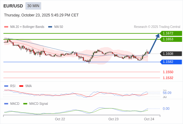 欧元/美元 当日内 : 看涨,当 1.1582 为支撑位。