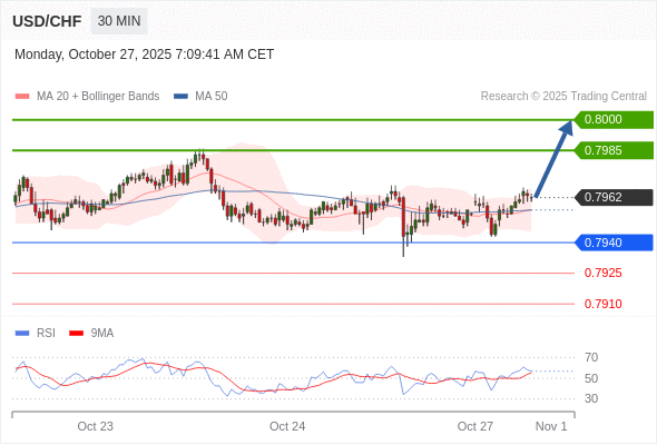美元/瑞郎 当日内: 在0.7940之上,看涨。