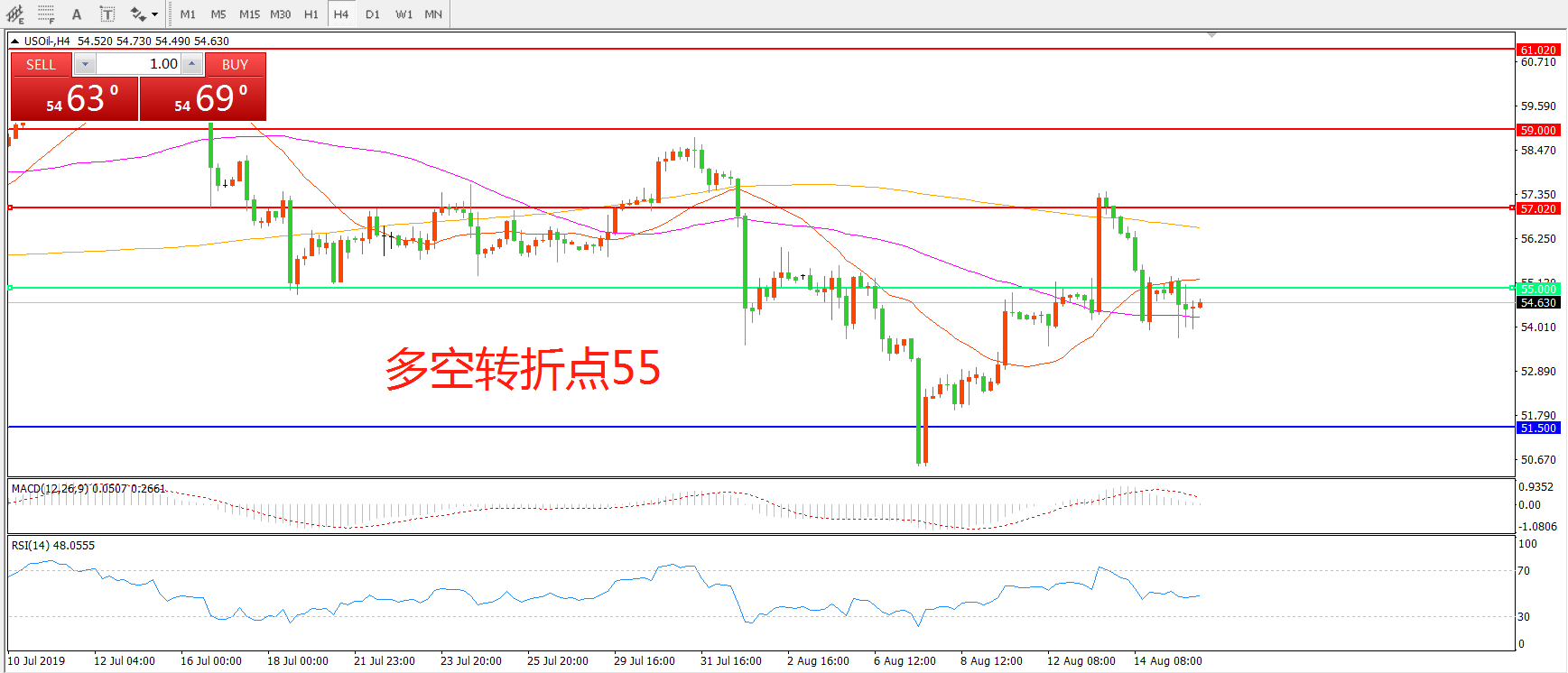 周四(8月15日),针对美国贸易代表办公室宣布将对约3000亿美元自华进口商品加征10%关税,国务院关税税则委员会有关负责人表示,中方将不得不采取必要的反制措施,这令中美贸易紧张局势继续升温,风险情绪遭受抑制令原油连跌两日。美国WTI原油震荡下行,收报54.66美元/桶。
