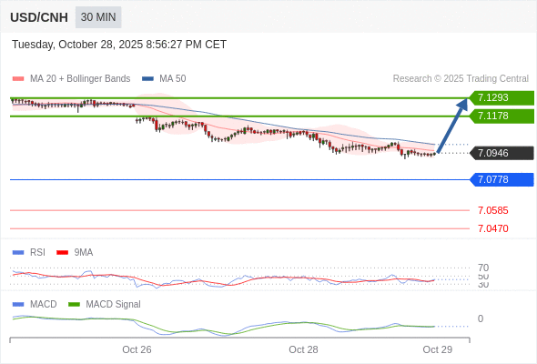 备选策略: 向下跌破 7.0778 ,将带来继续下跌的趋势,目标位为 7.0585 然后为 7.0470 。