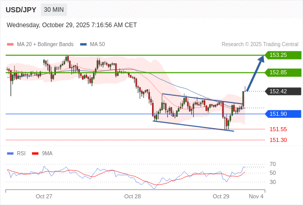 在 151.90 之上,看涨,目标价位为 152.85 ,然后为 153.25 。