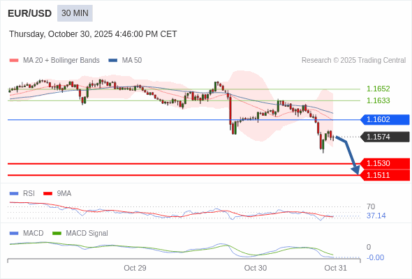欧元/美元 当日内 : 看跌,在 1.1602 之下。
