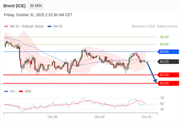交易策略: 在 64.50 之下,看跌,目标价位为 63.40 ,然后为 63.00 。