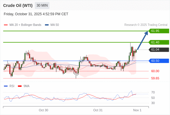 在 60.50 之上,看涨,目标价位为 61.40 ,然后为 61.95 。