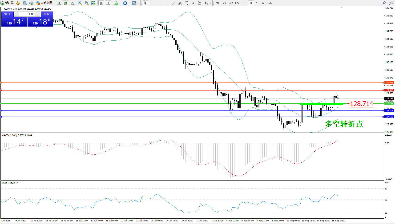 交易策略:128.714上方看涨,目标129.813、130.441