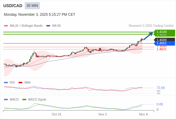 美元/加元 当日内 : RSI是超买的