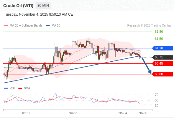 在 61.10 之下,看跌,目标价位为 60.45 ,然后为 60.00 。