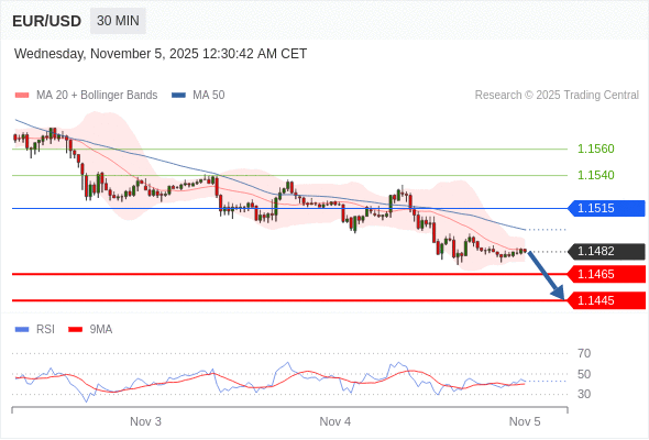 在 1.1515 之下,看跌,目标价位为 1.1465 ,然后为 1.1445 。