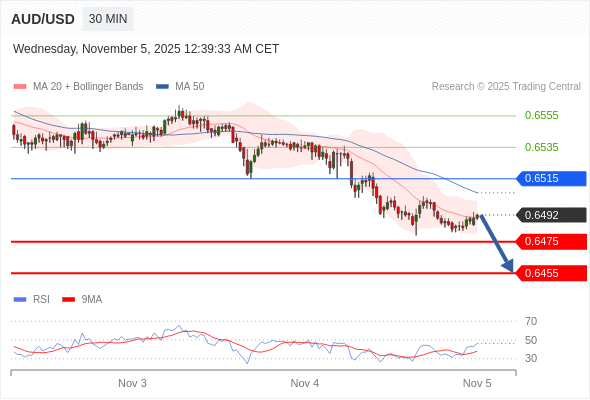 在 0.6515 之下,看跌,目标价位为 0.6475 ,然后为 0.6455 。