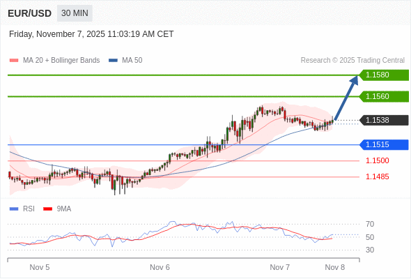 在 1.1515 之上,看涨,目标价位为 1.1560 ,然后为 1.1580 。