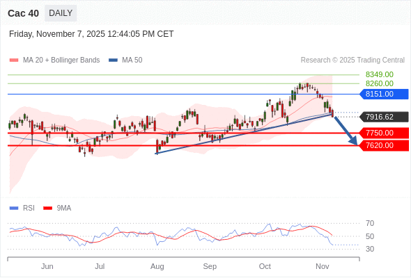 Cac 40 短线: 突破短期上升支撑趋势线。