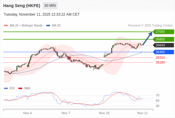 香港恒生指数期货 当日内: 在26460之上,看涨。
