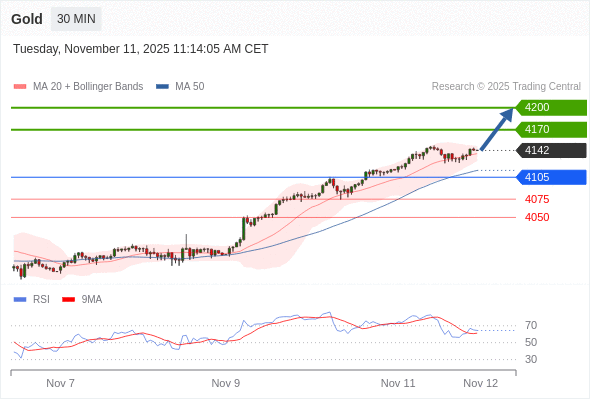 在 4105 之上,看涨,目标价位为 4170 ,然后为 4200 。