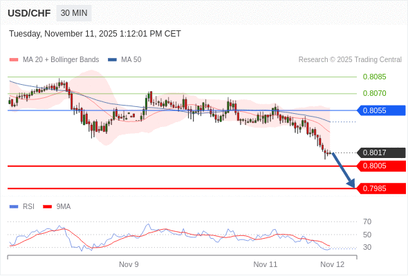 在 0.8055 之下,看跌,目标价位为 0.8005 ,然后为 0.7985 。