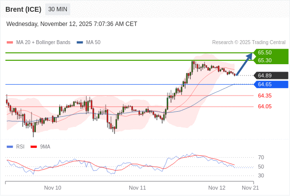 在 64.65 之上,看涨,目标价位为 65.30 ,然后为 65.50 。