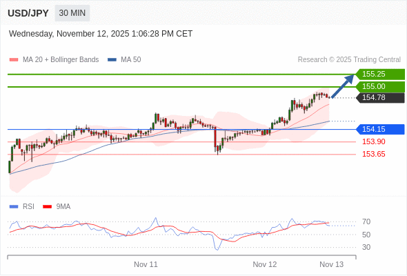 在 154.15 之上,看涨,目标价位为 155.00 ,然后为 155.25 。