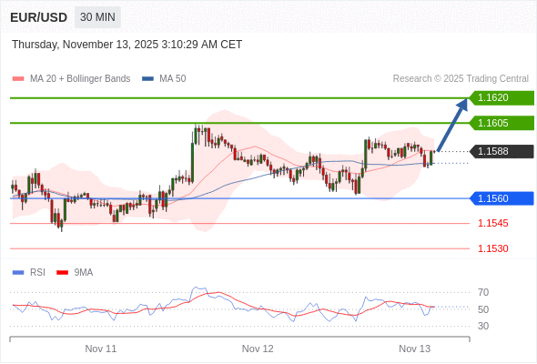 交易策略: 在 1.1560 之上,看涨,目标价位为 1.1605 ,然后为 1.1620 。
