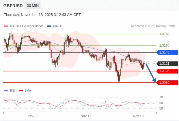 在 1.3145 之下,看跌,目标价位为 1.3105 ,然后为 1.3080 。