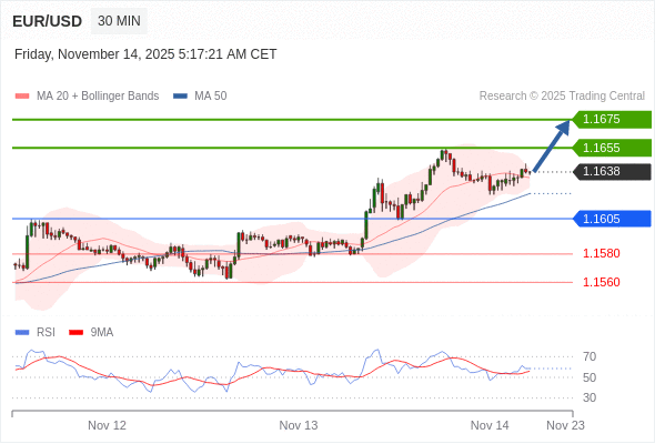 在 1.1605 之上,看涨,目标价位为 1.1655 ,然后为 1.1675 。