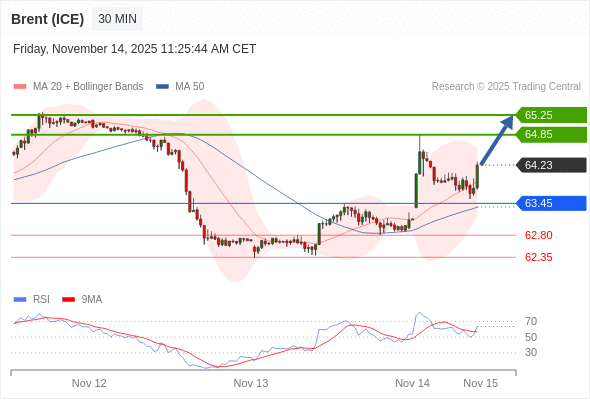 在 63.45 之上,看涨,目标价位为 64.85 ,然后为 65.25 。