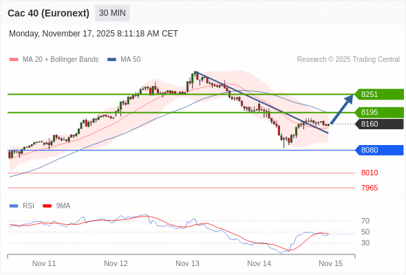 法国CAC指数期货 (Euronext) (X5) 当日内: 超短线(当日内)支撑位在8080附近。