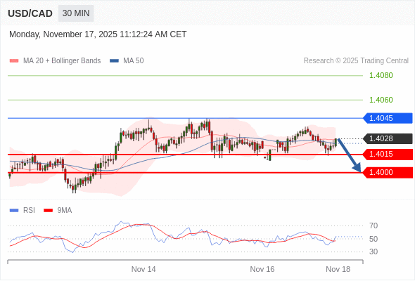 在 1.4045 之下,看跌,目标价位为 1.4015 ,然后为 1.4000 。
