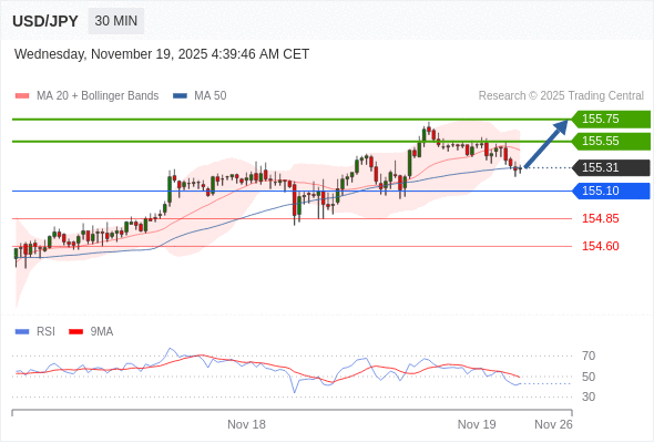 在 155.10 之上,看涨,目标价位为 155.55 ,然后为 155.75 。