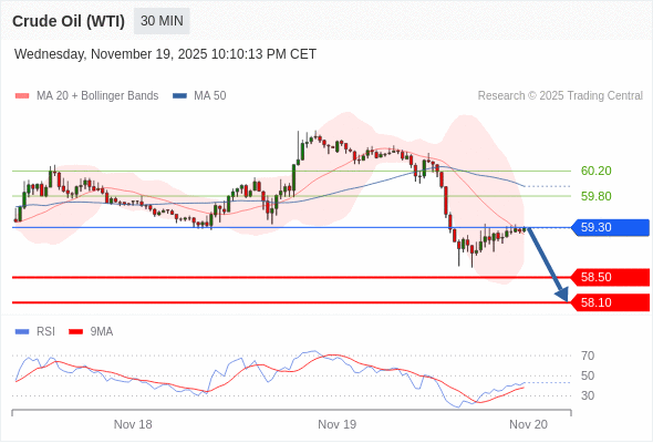 在 59.30 之下,看跌,目标价位为 58.50 ,然后为 58.10 。