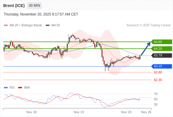 在 63.15 之上,看涨,目标价位为 64.20 ,然后为 64.60 。