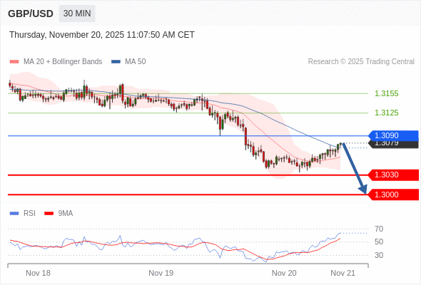 交易策略: 在 1.3090 之下,看跌,目标价位为 1.3030 ,然后为 1.3000 。