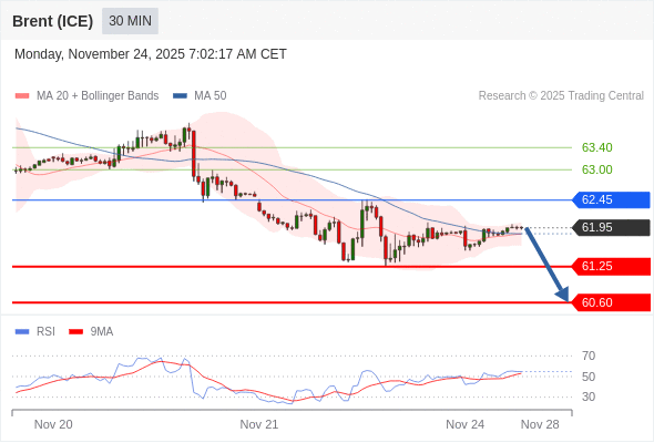 交易策略: 在 62.45 之下,看跌,目标价位为 61.25 ,然后为 60.60 。