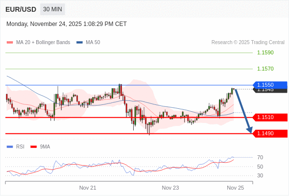 欧元/美元 当日内: 短期关键阻力位在1.1550。