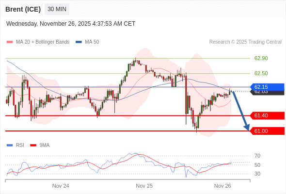 交易策略: 在 62.15 之下,看跌,目标价位为 61.40 ,然后为 61.00 。