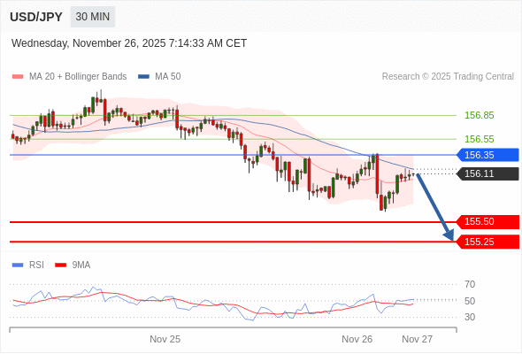 交易策略: 在 156.35 之下,看跌,目标价位为 155.50 ,然后为 155.25 。