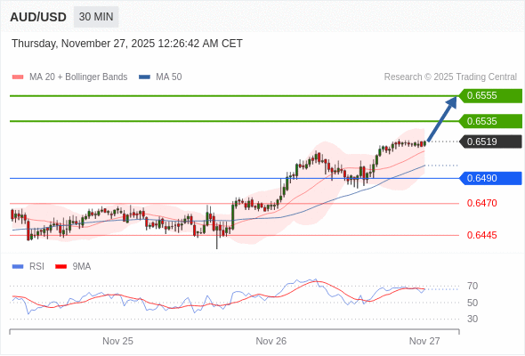 在 0.6490 之上,看涨,目标价位为 0.6535 ,然后为 0.6555 。