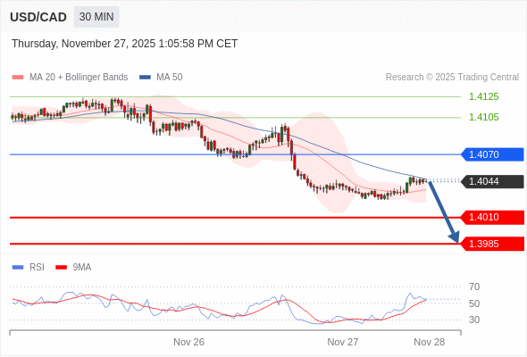 在 1.4070 之下,看跌,目标价位为 1.4010 ,然后为 1.3985 。