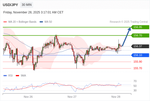 在 156.10 之上,看涨,目标价位为 156.70 ,然后为 156.95 。