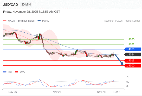 在 1.4050 之下,看跌,目标价位为 1.4015 ,然后为 1.4000 。