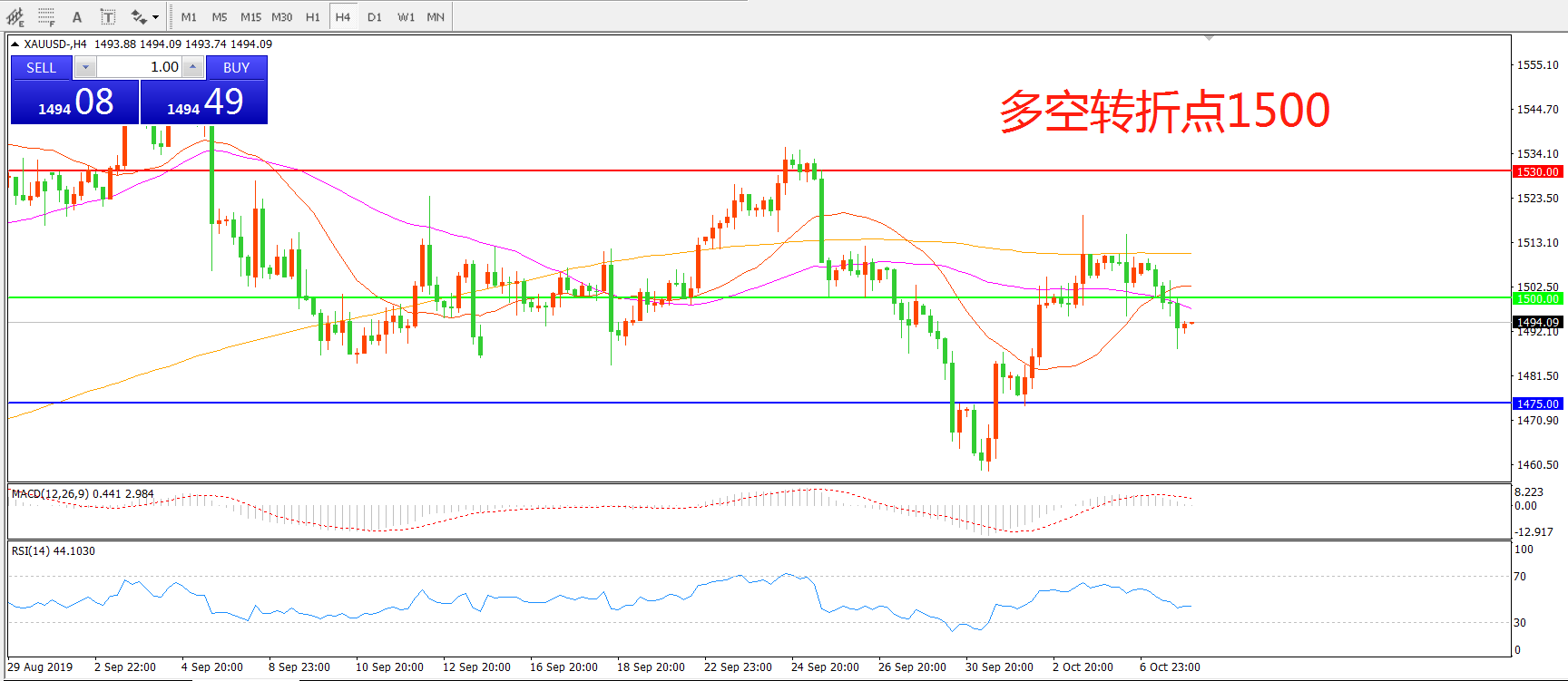 4小时图看,金价继续围绕千五关口进行争夺,200周期均线成为上方阻力,MACD红柱减少,RSI指标走平,日内延续下行概率较大。