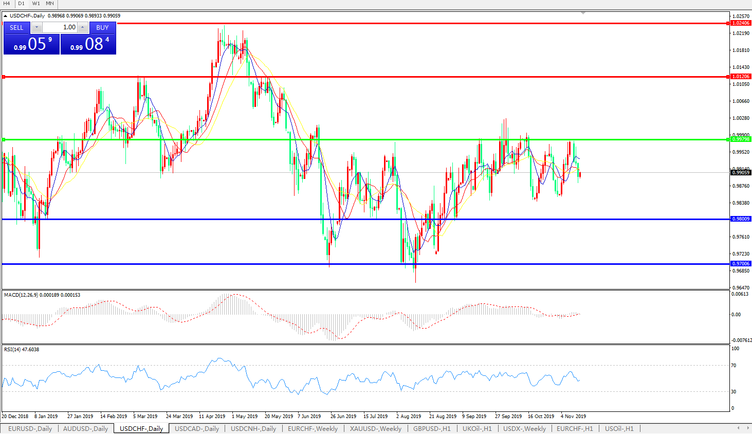 美元兑瑞郎在周三日内承压走低,因在美国总统特朗普隔夜讲话的措辞不甚积极之后,市场避险情绪重新升温,令避险货币瑞郎再度迎来大量买需。全球投资者对于贸易环境前景仍有疑虑,且从OECD和IMF等机构得到的数据也显示全球经济仍有下行压力; 在此状况下,瑞士央行行长乔丹日内发表的鸽派讲话惨遭市场无视。尽管他再度强调负利率政策有充分的必要性,且央行仍做好了随时入市干预汇率的准备,但在市场情绪由喜转忧的大背景之下,美元兑瑞郎并未因此而有任何显著反弹,反而进一步加深跌势;美元兑瑞郎因此失守0.99关口,跌至一周多低点0.9894,下方或挑战0.9879处的100日均线支撑位。市场正关注美联储主席鲍威尔日内稍后讲话对汇市走向的进一步指引。