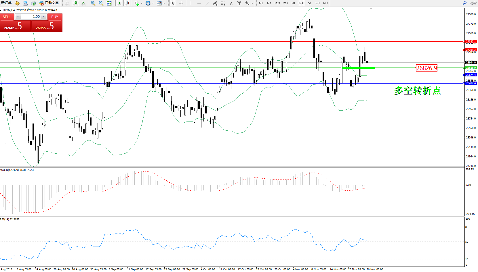 香港恒生指数1126日(周二)收盘下跌79.12点,跌幅0.29%,报26913.92点;昨晚夜期受惠好消息出台,率先冲上27000关口以上收市。港股早上高开扩大升幅,最高触及27227后继续下挫,当前市场消息面静淡,整固行情在所难免,预计恒指仍会继续调整。阿里巴巴今日登陆港交所,上市首日收涨6.59%,收报187.60港元,总市值超过4万亿港元,超过腾讯,成为新的“港股之王”。