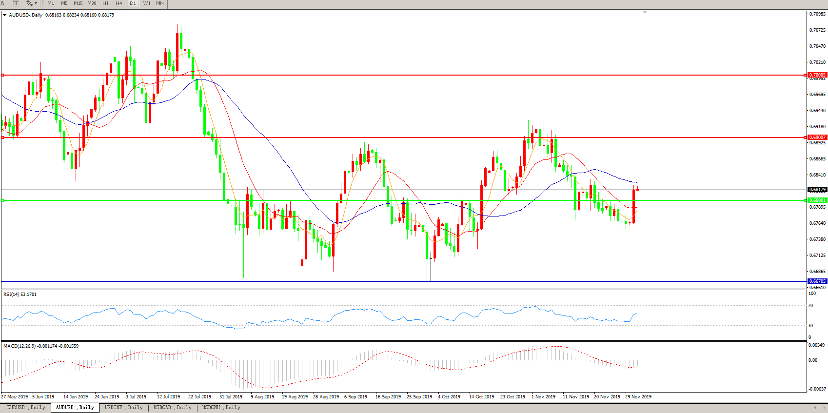 澳元兑美元在周一小幅走高,脱离上周五录得的一个半月低位。此前,中国方面在周末发布了强于预期,重新站上枯荣线的11月制造业PMI数据,这对于与中国经贸往来密切的澳洲经济也是利多,并且继续趋于乐观的全球贸易局势也对澳元也支撑作用;不过,澳元汇价的上涨幅度却仍然受限,0.68关口依旧可望不可及,原因在于投资者面对周二澳洲联储年内最后一次政策会议之前景仍充满戒心。虽然,市场普遍预计澳洲联储立即降息可能仍不大,但仍很可能释放额外宽松信号,为明年2月的下次会议上降息铺平道路。 在此状况下,澳元汇价仍未摆脱过去一个月来的阴跌下行趋势,仅在上破0.6786这一10日均线切入位后,趋势反转才能燃起一丝希望,而这需要内外部基本面消息,及澳洲联储意外偏向鹰派政策姿态的共同配合,方才能够达成。